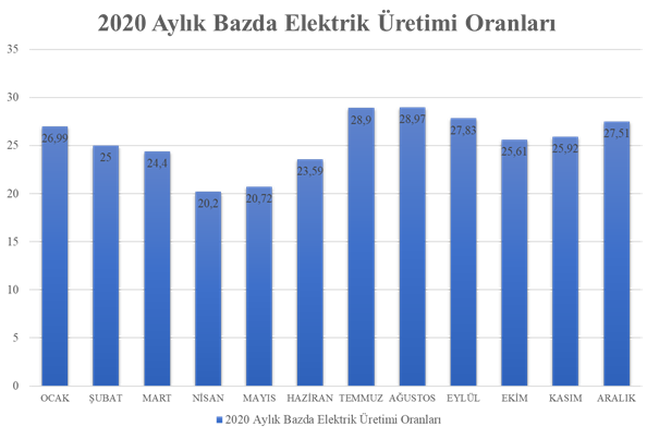 2020 Yılı bazında Türkiye genelinde yaklaşık olarak elektrik üretimine bakıldığında ise, en yüksek üretimin Temmuz,2020 ayında 28,9 teravatsaat (TWh) ve Ağustos,2020 ayında yaklaşık 28,93 TWh ile yaz aylarında olduğu görülmektedir.